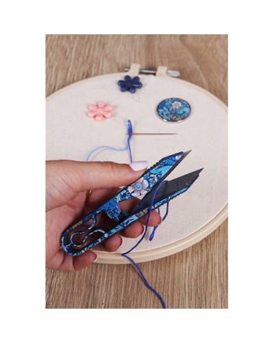 Lo más llamativo es su acabado decorativo en tonos azules con motivos florales, que aporta un toque elegante y original a tu kit de costura, convirtiéndolo en una herramienta práctica y al mismo tiempo estética.