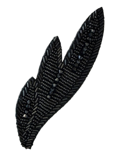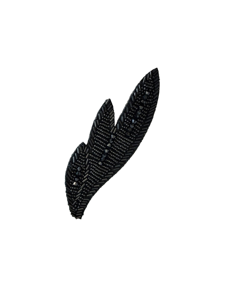 Diseñada con cuentas y cristales negros cuidadosamente dispuestos, aporta un acabado lujoso y artesanal ideal para vestidos, chaquetas, bolsos y accesorios.