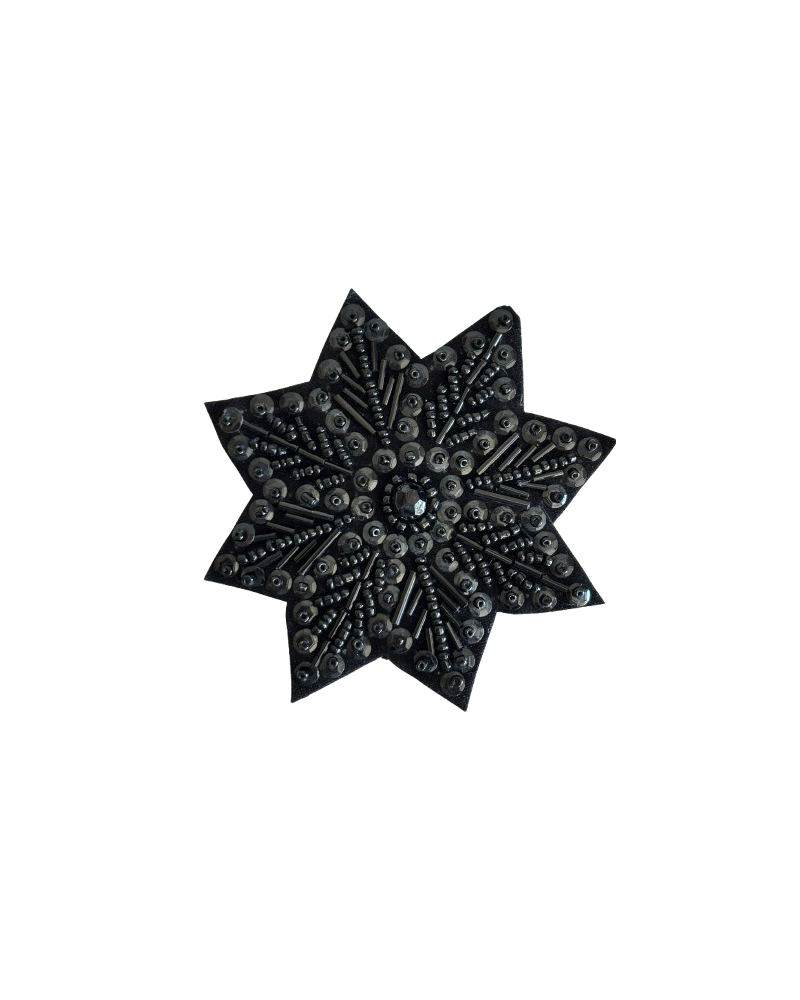 Diseñada con cuentas y cristales negros cuidadosamente dispuestos, aporta un acabado lujoso y artesanal ideal para vestidos, chaquetas, bolsos y accesorios.