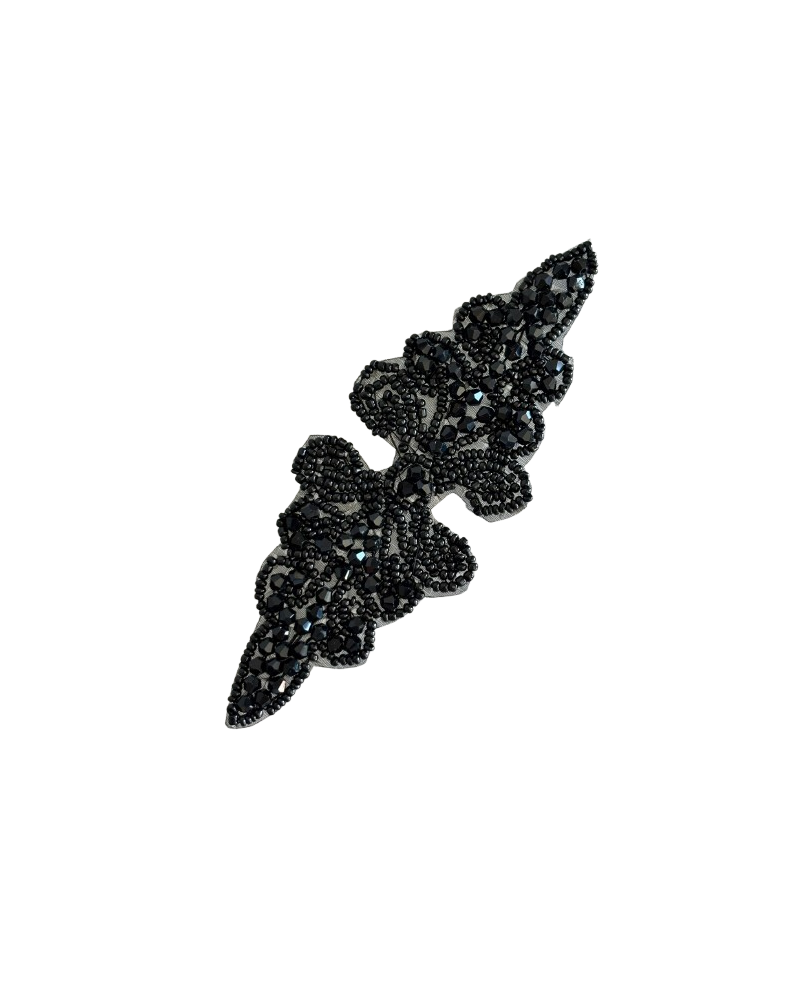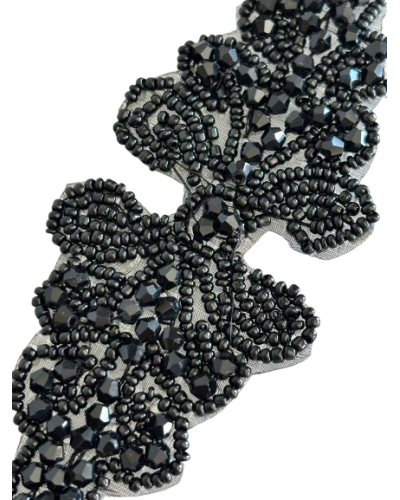 Diseñada con cuentas y cristales negros cuidadosamente dispuestos, aporta un acabado lujoso y artesanal ideal para vestidos, chaquetas, bolsos y accesorios.