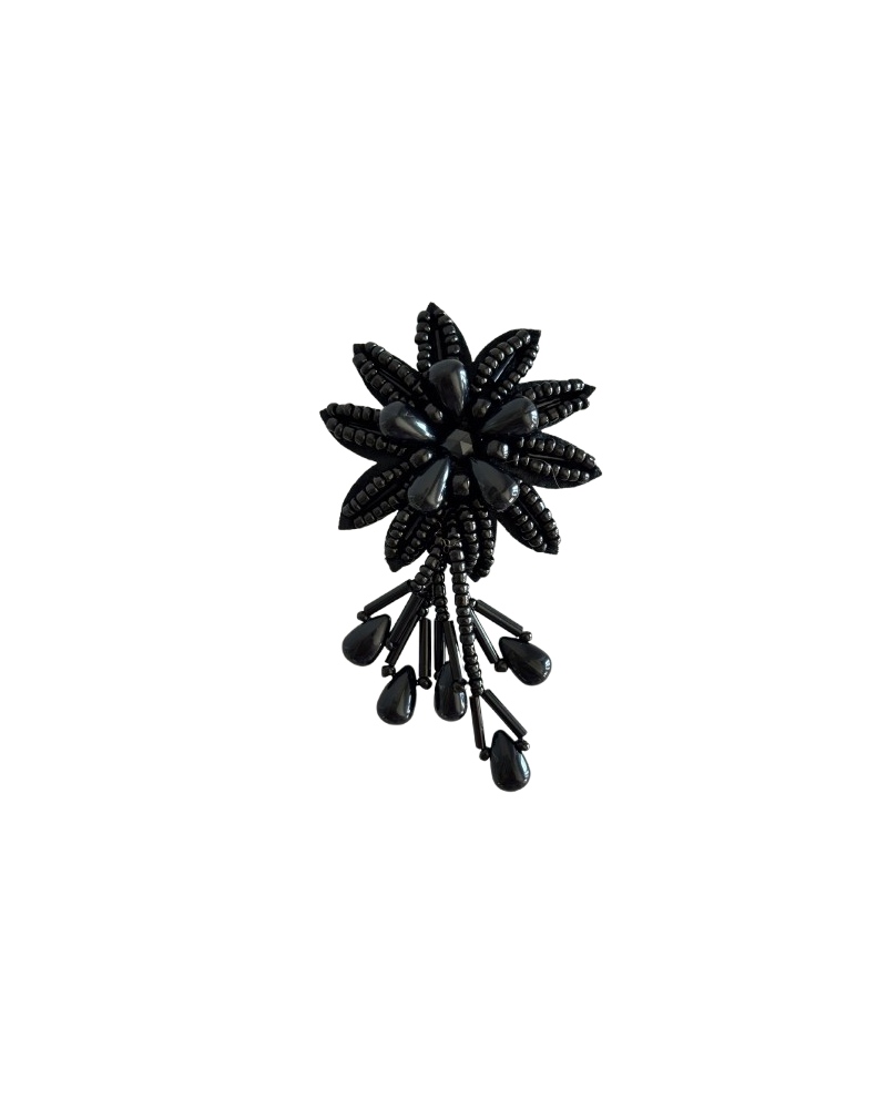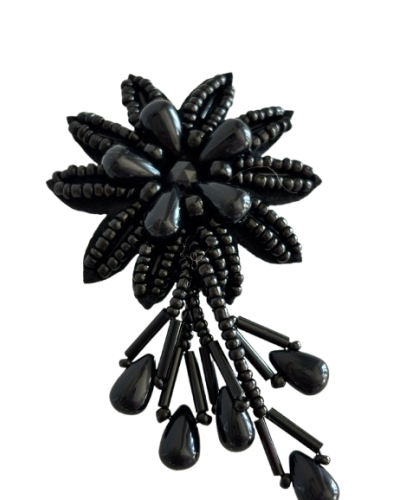 Diseñada con cuentas y cristales negros cuidadosamente dispuestos, aporta un acabado lujoso y artesanal ideal para vestidos, chaquetas, bolsos y accesorios.