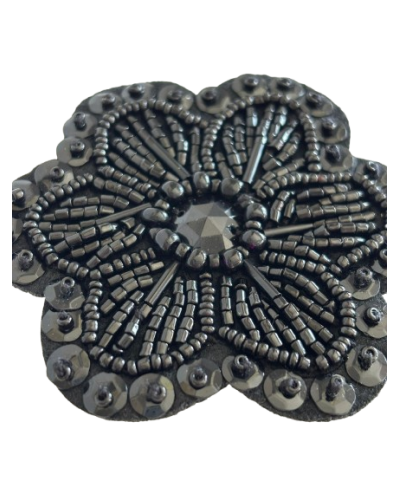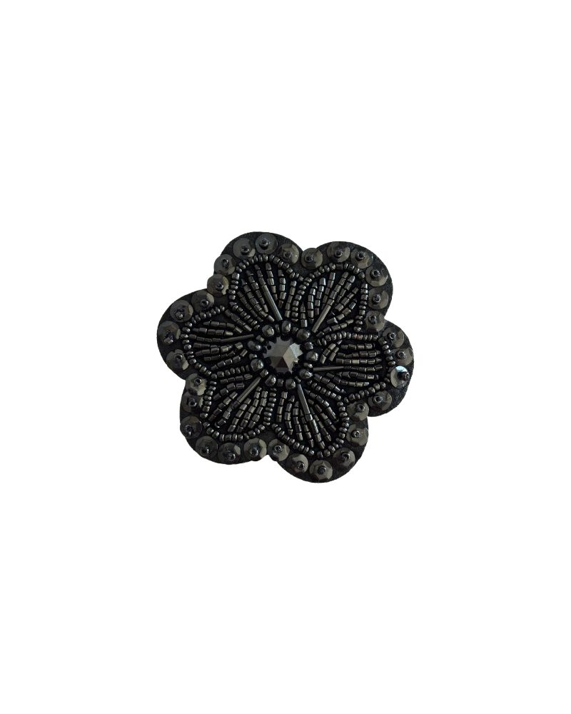 Diseñada con cuentas y cristales negros cuidadosamente dispuestos, aporta un acabado lujoso y artesanal ideal para vestidos, chaquetas, bolsos y accesorios.
