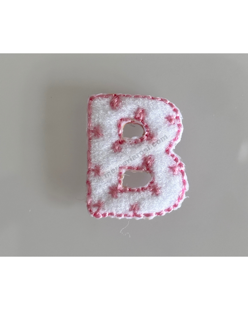 Divertidas y dulces letras termoadhesivas con fondo blanco y ribete rosa, ideales para personalizar prendas, mochilas, toallas o accesorios infantiles.