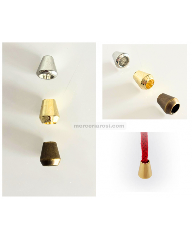 Terminales de campana metálicos ideales para rematar cordones, cintas y cordeles de forma limpia y decorativa.