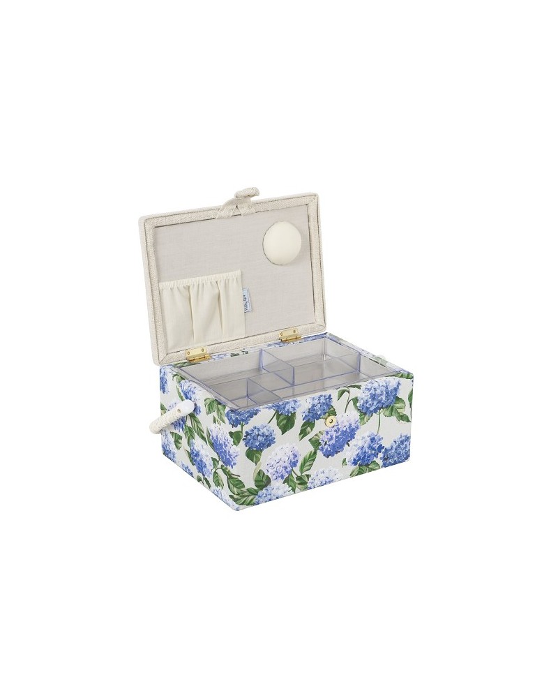 Costurero forrado en tela con precioso estampado de hortensias, perfecto para mantener todos tus accesorios de costura ordenados con estilo.