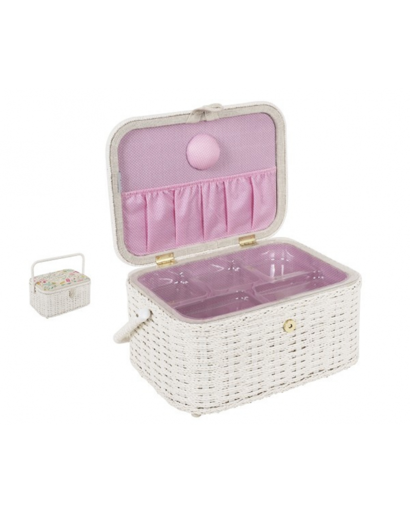 Incorpora un práctico acerico en la parte interior de la tapa para tener siempre a mano alfileres y agujas, así como un cierre seguro y asa superior que permite transportarlo cómodamente.