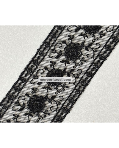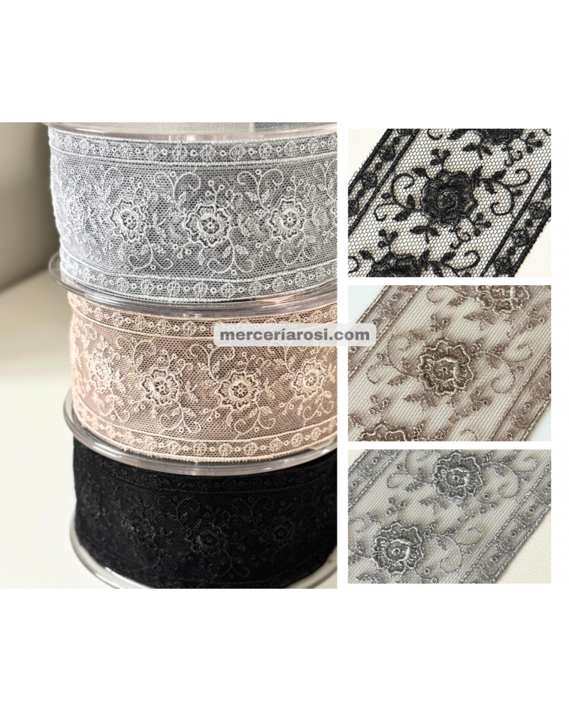 Este encaje se caracteriza por su fina base de tul y su bordado floral detallado, que combina ligereza y resistencia en una pieza versátil y atemporal.