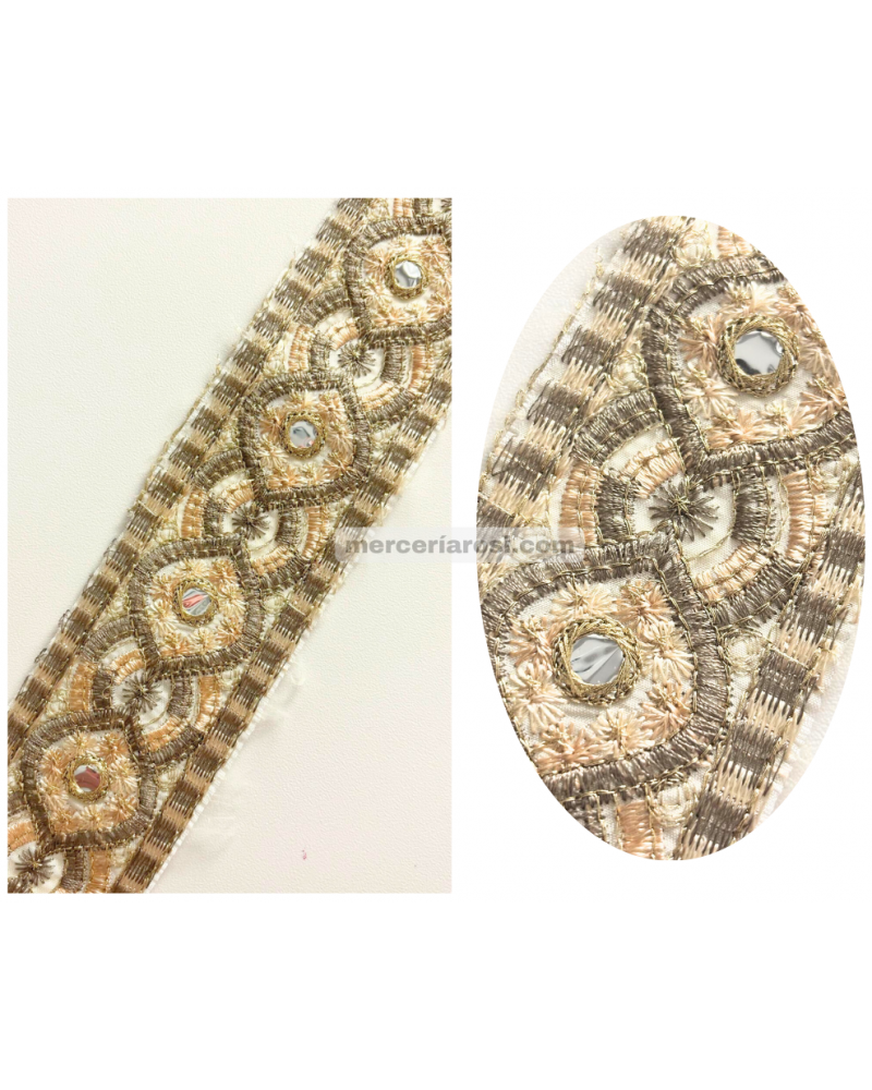 Galón bordado metalizado con diseño ornamental y acabado brillante.