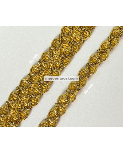 Galón de pasamanería metalizado de diseño refinado y elegante, caracterizado por un delicado patrón de bucles entrelazados que crea un efecto ornamental con gran riqueza visual.