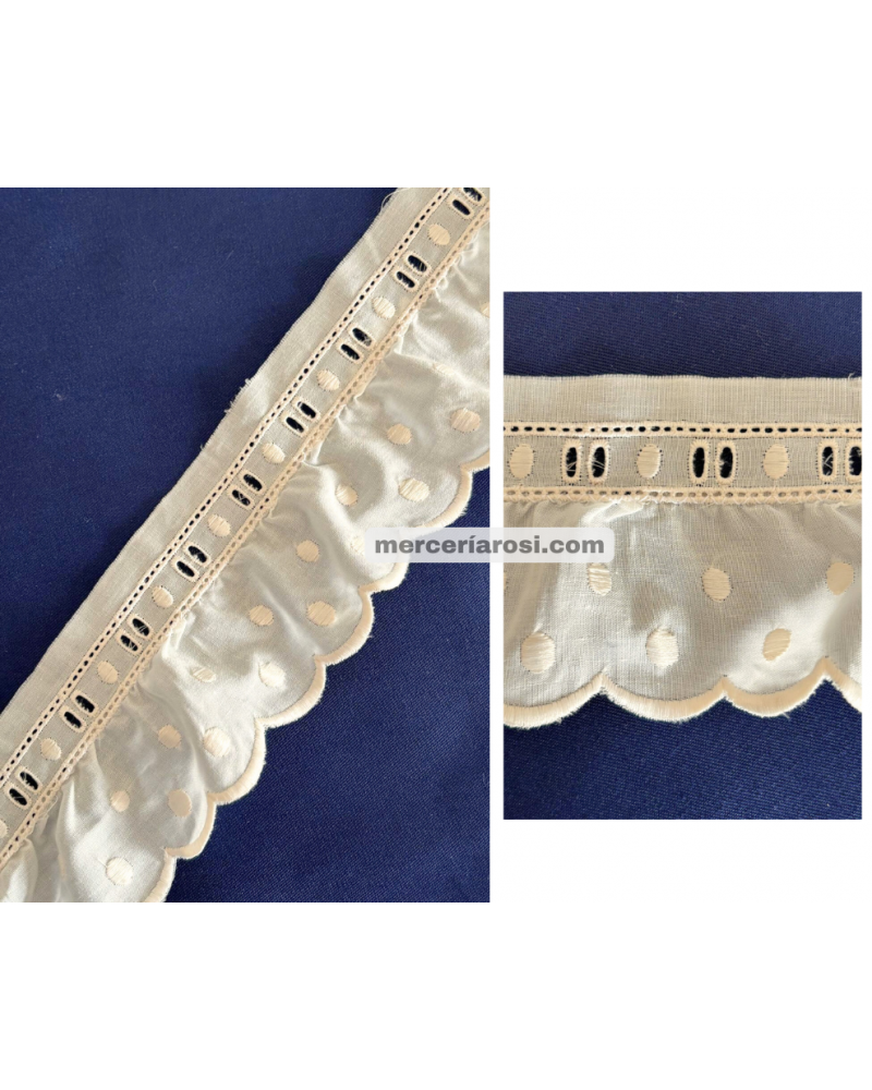 Su diseño combina un tejido bordado con detalles calados y acabado ondulado, que aporta volumen y movimiento a las prendas o complementos donde se aplica.